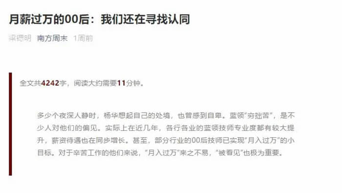 近日,《南方周末》刊登了一篇文章《月薪過萬的00后:我們還在尋找認同》,文章中講述了三位00后汽修技師從月薪幾千到月薪過萬的經(jīng)歷。