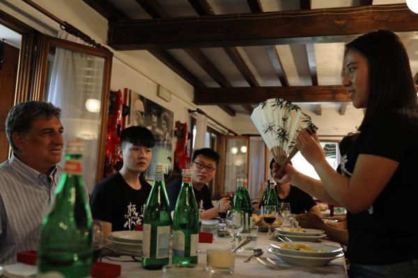 在法拉利餐廳,極速少年團送給隨行工程師克勞迪奧極具中國特色的禮物——宣紙折扇,并演示如何使用。扇面圖案為竹林,體現(xiàn)中國文人謙虛的品質(zhì),也彰顯汽車人們的不斷鉆研和上進的精神。