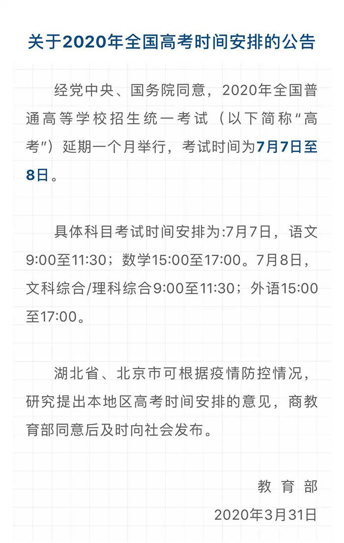 教育部今日下達通知,2020年高考時間推遲一個月,考試時間為7月7日至8日,湖北省、北京市高考時間依舊待定。