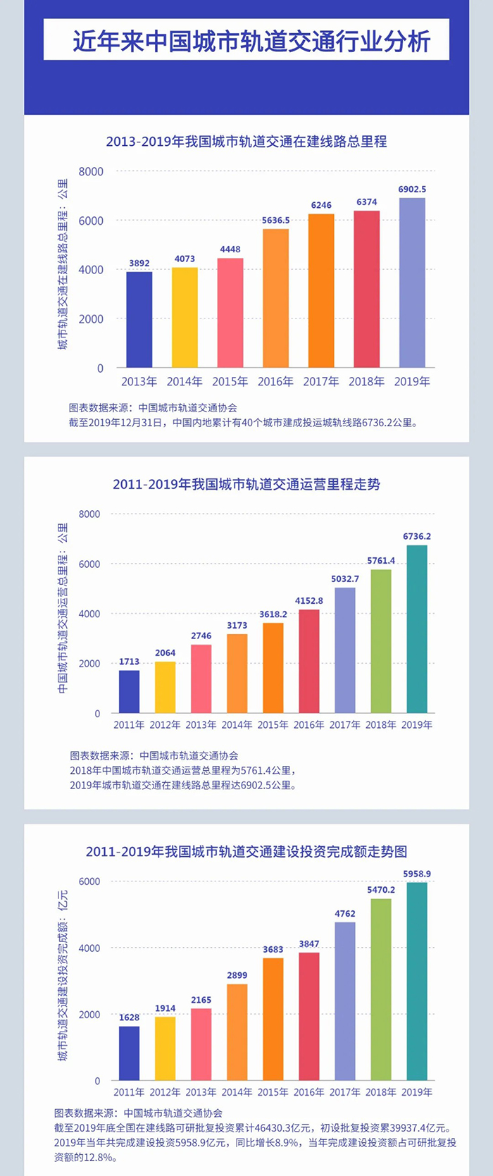 數據顯示:截至2019年12月31日,中國內地累計有40個城市建成投運城軌線路6736.2公里。2018年中國城市軌道交通運營總里程為5761.4公里,2019年城市軌道交通在建線路總里程達6902.5公里。