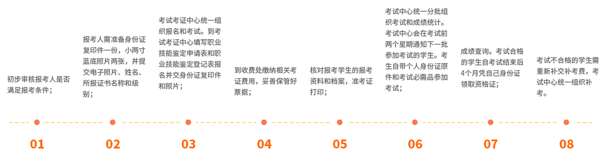 證書考試一般是在每月15號前提交考證資料,學(xué)校審核后上報鑒定中心,考試一般安排在下月進行。